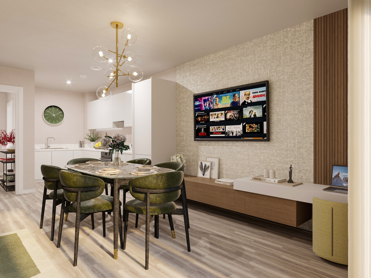 Each residence exudes modern design, boasting open-plan living spaces and integrated appliances in handleless kitchens. These homes emphasize functionality and style, offering ample natural light and high-quality finishes throughout.